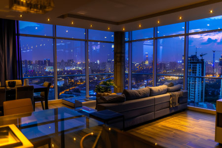 Luxurious open plan living room with comfortable seating offering stunning panoramic views of a vibrant cityscape at dusk