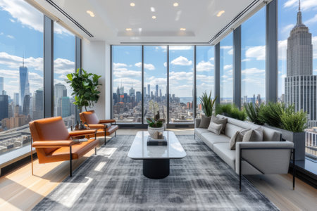 A spacious urban loft featuring large windows that offer a stunning view of the city skyline, complemented by indoor plants, creating a serene and stylish atmosphere.