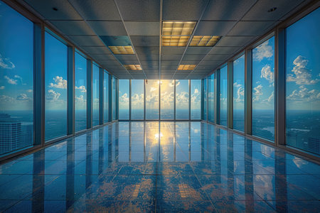 Modern office building interior with panoramic city skyline and empty floor
