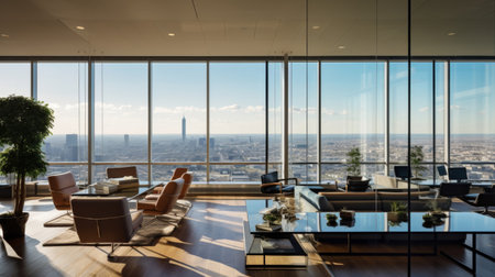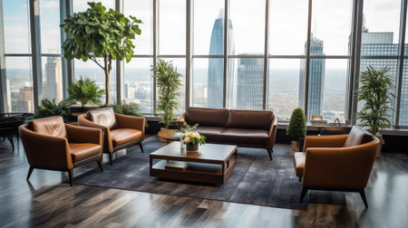 captures a modern high-rise office interior with panoramic views of a sprawling city. Floor-to-ceiling glass walls allow natural light to flood the space, highlighting the clean and minimalist Lush indoor plants in large white planters add a touch of nature and freshness to the environment. The workspace is organized with contemporary desks, chairs, and computers, suggesting a focus on productivity and collaboration. The overall atmosphere is bright, spacious, and offering an inspiring...