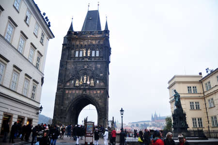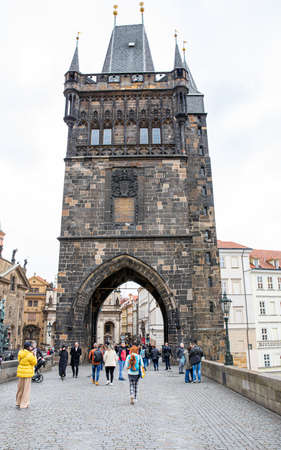 Czechia people and foreign travelers walking travel visit Charles Bridge and classic ancient antique building gate tower in winter seasonal at Praha city on November 11, 2016 in Prague, Czech Republic