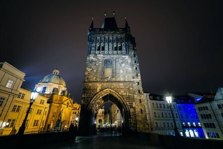 A tower of the Charles Bridge at night, in Prague, Czech Republic.