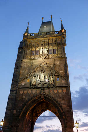 Old tower on Charles Bridge in center of Prague, Czech Republic