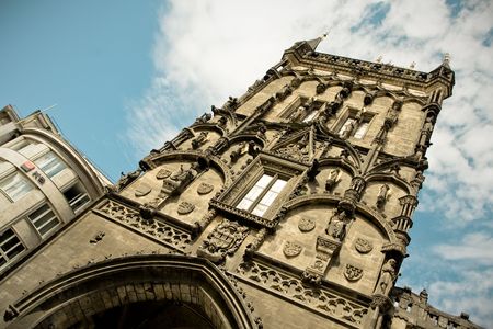 Close up detailed historical gothic stone tower view in Prague, on cloudy blue sky background.