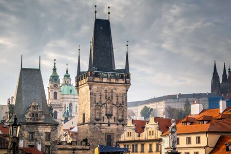 Morning view of Charles Bridge and Lesser Town Bridge Tower in historical centre of Prague.