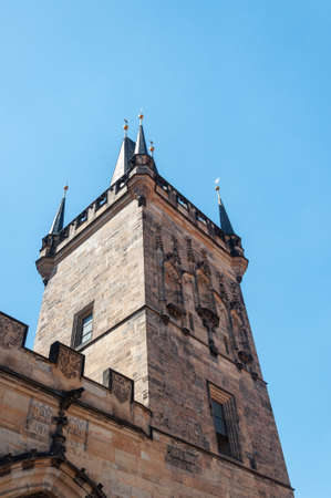 Old Town Bridge Tower (Stare Mesto Tower) near Charles Bridge (Karluv Most) in Prague, Czech Republic. Close up view with blue sky.