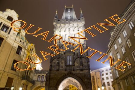 Coronavirus in Prague, Czech Republic. Powder tower (gate) at evening. Quarantine sign on a blurred background. Concept of COVID pandemic and travel in Europe.