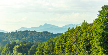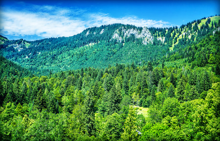 Mountain and alpine hill landscape mountains and rocks peaks panorama with green fields forest fir trees nature and blue sky in the Eastern Alps Salzburg Region Austria.