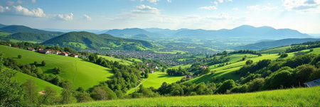 Scenic green valley and mountain landscape with rolling hills and village. That the image is generated using AI.