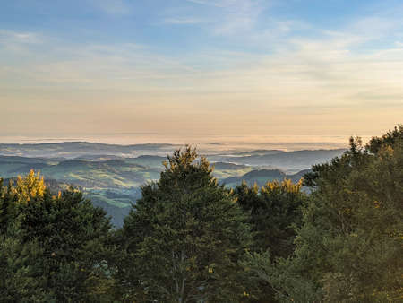 View from top of a mountain in the valley with clouds on the sky and mountains on the background and trees in front of in the bavarian forest