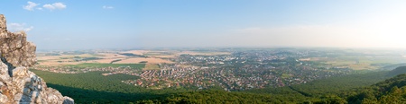 Skyline of the city with the surrounding fields a woods under the blue sky