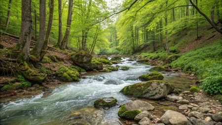 A flowing river carves through a dense forest, rocks line its banks, under a cloudy sky
