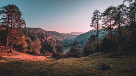 A breathtaking view of a misty landscape at dusk showcasing vibrant forests and rolling hills, enveloped in soft pink light, perfect for nature enthusiasts.