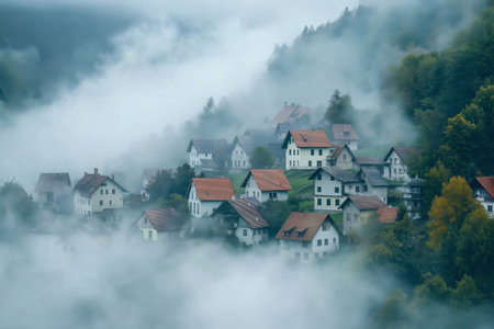 Small village is nestled in the hills, with the morning fog rolling in and covering the houses