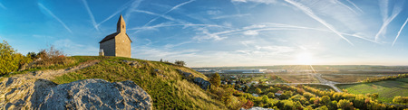 Romanesque church Saint Michael, Drazovce village and industrial park Nitra - North in sunset, Slovak republic. Autumn panoramic scene. Landscape in middle Europe.