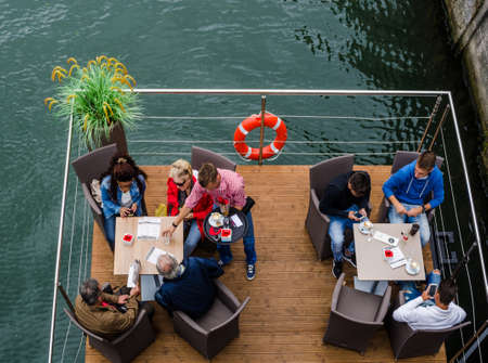 LJUBLJANA, SLOVENIA, JULY 29, 2015: aerial view of a group of people enjoying summer day on a floating terrace restaurant situated on ljubljanica river in the slovenian capital ljubljana.
