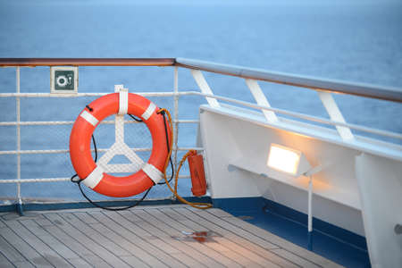 a ship deck overlooking a vast blue ocean, adorned with a buoy and lifebuoy, creating a captivating maritime background