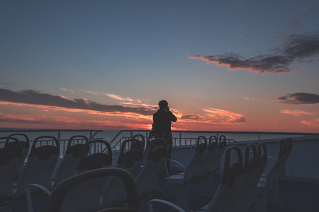 A man stands on the deck of the ferry and watches the sunset at Atlantic ocean. Polar sun