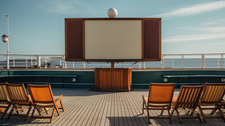 Empty cruise ship deck overlooking the ocean, no people, with room for text or branding