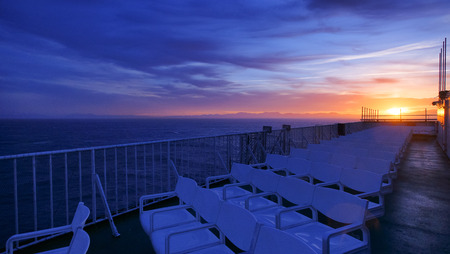 Epic sunrise on the sea viewed from the deck of a crusing ship heading for Sweden. Wooden railing and staircase to lower deck in front. Sunstar and dramatic clouds on the distant horizon.