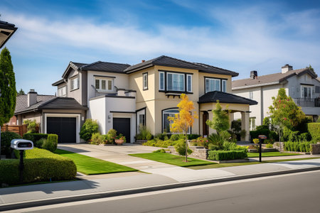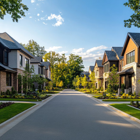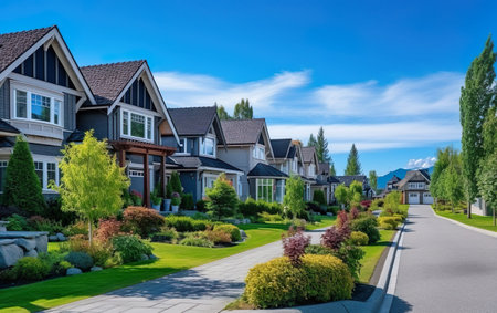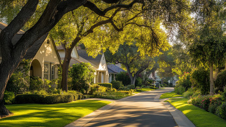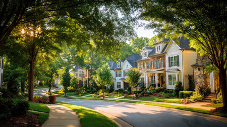 A vibrant suburban street featuring luxurious homes, lush greenery, and a tranquil atmosphere. Perfect for illustrating a peaceful residential neighborhood scene.