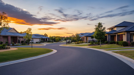 A serene residential neighborhood showcasing modern homes under a beautiful sunset. Sunshine casts warm light on the well-designed streets and lush landscaping, creating a peaceful atmosphere ideal for family living.