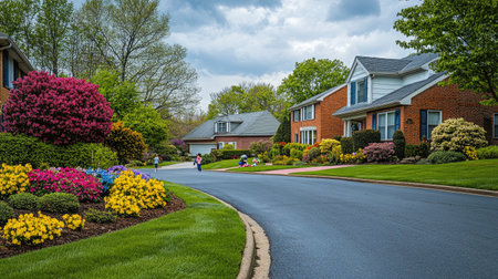 A beautiful suburban street adorned with vibrant flowers and lush trees, creating a serene and picturesque atmosphere perfect for outdoor relaxation.