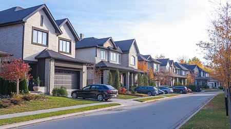 A picturesque suburban neighborhood showcases modern homes under a clear blue sky, featuring manicured lawns and well-maintained driveways, inviting a serene lifestyle.
