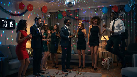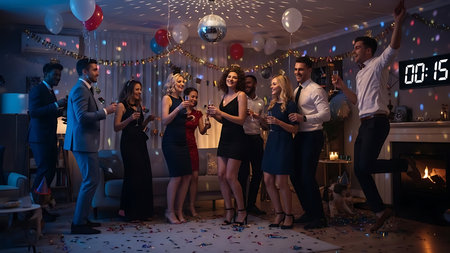 Joyful friends toast with champagne during a festive New Year's Eve countdown.