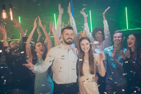 Full length body size photo of cheerful charming beautiful young people having fun at night club dancing in falling confetti rain standing under lights