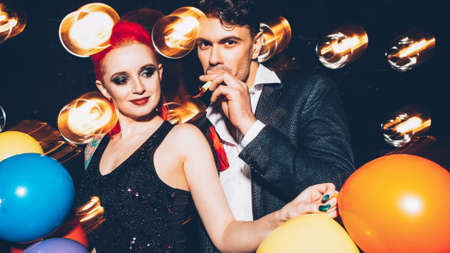 Retro style party. Couple dancing with colorful balloons, having fun at nightclub. Blur spotlights glow in background.