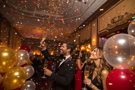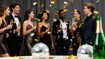 A group of friends celebrate with confetti and laughter at a luxurious black-tie party.