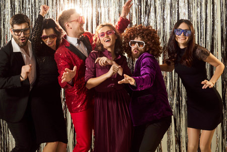 Group of friends having fun at retro dance party. Nostalgia concept with people dancing in night club