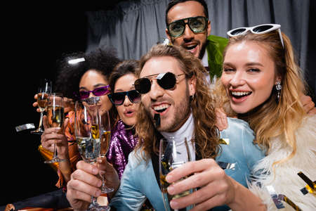 happy interracial friends holding glasses of champagne on black, banner