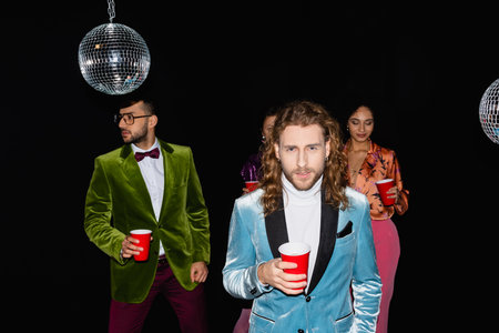 young adult man holding plastic cup on party with blurred multiracial friends standing on black background