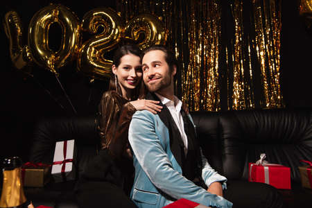 happy woman embracing elegant man on sofa near golden new year decoration on black