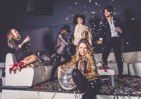 Group of young friends celebrating New Year's Eve in a nightclub.