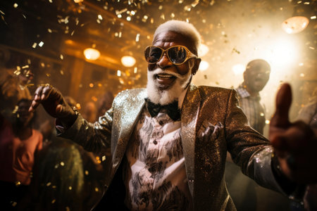 Group of happy people in formalwear dancing and having fun together with confetti flying all around