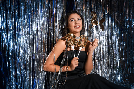 Young woman with figure 2024 against silver tinsel
