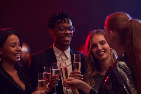 cheerful friends clinking glasses of champagne and celebrating new year at nightclub