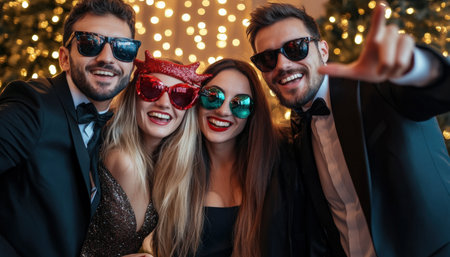 Party gathering fun, friends posing, dancing, wearing playful party glasses and bright festive outfits, vibrant shimmering silver tinsel, bright lights, joyful lively party happiness, celebrating joy