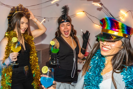 Young women friends celebrating new year's eve or a costume party indoors, laughing and dancing while holding colorful cocktails, surrounded by festive decorations and lights