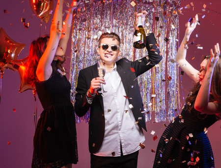 People dancing with confetti at a party in the night club.