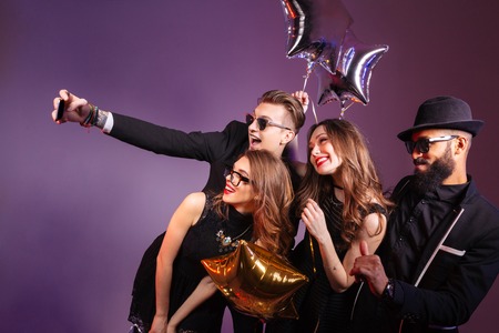 Group of cheerful young people taking selfie over purple background