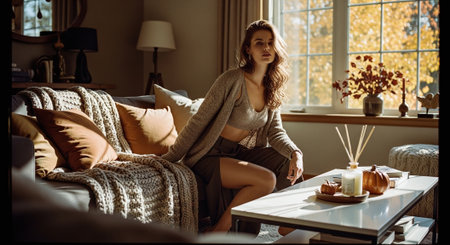 Portrait of a beautiful young woman sitting on a sofa at home