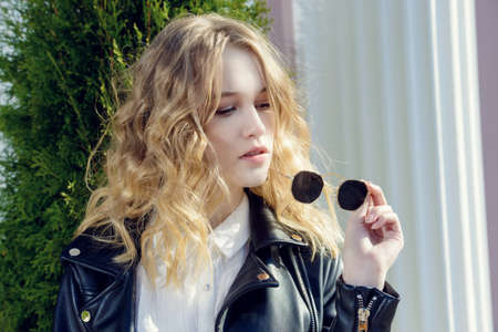Beautiful girl in a white coat and sunglasses walks along the street in spring