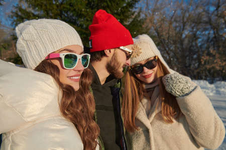 Portrait of a happy young man and girls in fashionable winter clothes who are standing in a winter park and smiling. Winter activities. Fashion.