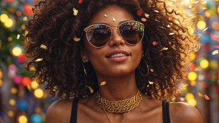 Young woman happily enjoying live music at an outdoor summer festival while wearing sunglasses