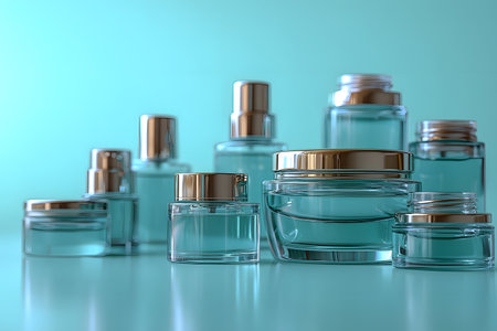 Elegant arrangement of various transparent cosmetic bottles with gold lids on a sleek turquoise background. ideal for beauty branding, product design, or advertising skincare and luxury cosmetics. Generative AI