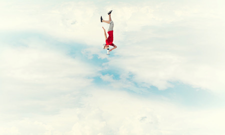Smiling young woman jumping and tumbling in the air against the blue sky.